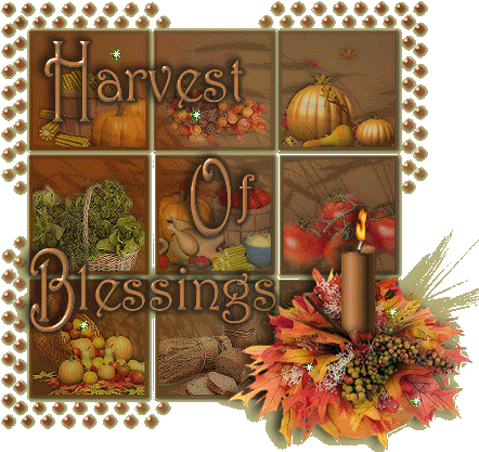 A festive animated graphic featuring 'Harvest Of Blessings' with autumn produce, leaves, and a candle for Thanksgiving.