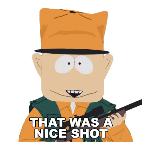 Jimbo Kern from South Park, wearing his hunting gear, compliments a good shot with the caption 'THAT WAS A NICE SHOT'.