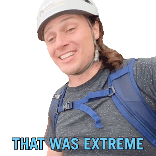 Michael Downie, wearing a helmet and backpack, reacts with a smile and the caption "THAT WAS EXTREME".