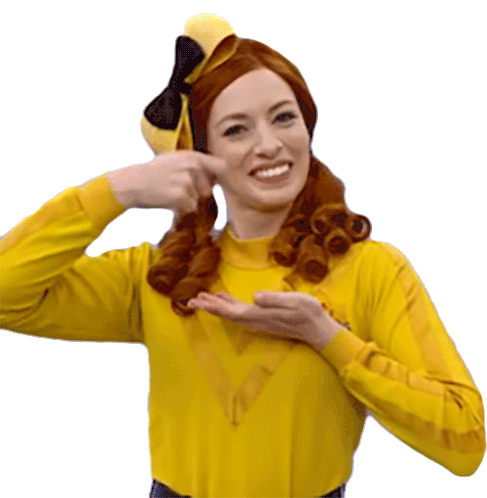Emma Wiggle, from The Wiggles, expresses enjoyment and fun with a cheerful gesture and smile.
