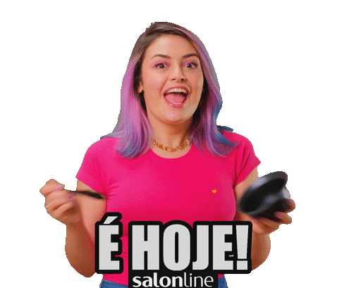 Thata Thais Cazelli, with vibrant pink and blue hair, excitedly announces 'É HOJE!' for Salon Line.