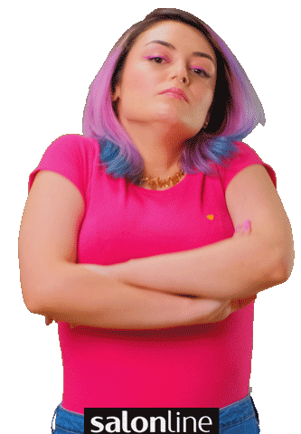 a woman with purple and blue hair is standing with her arms crossed in front of a salonline ad