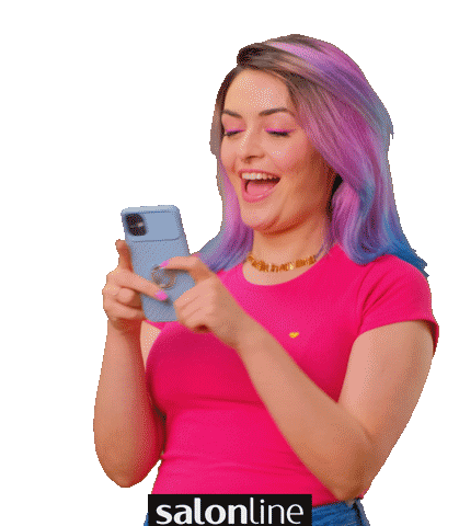 Thata Thais Cazelli happily interacts with her phone, smiling with her vibrant pink and blue hair, sharing news or gossip.
