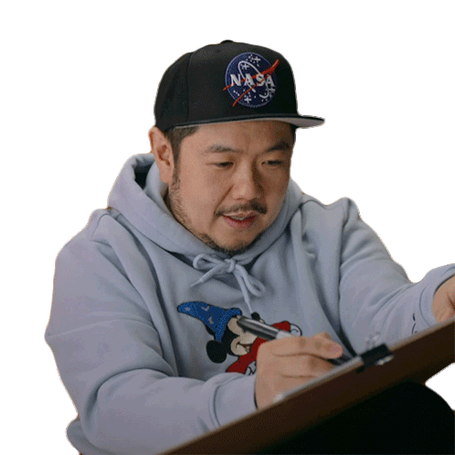 Eric Bauza, wearing a NASA hat, writes and says "That's Good Stuff" with a positive expression.