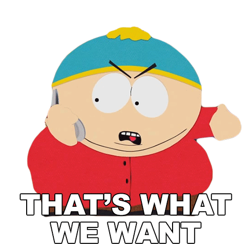 Eric Cartman from South Park, looking angry and determined, with the caption 'THAT'S WHAT WE WANT'.