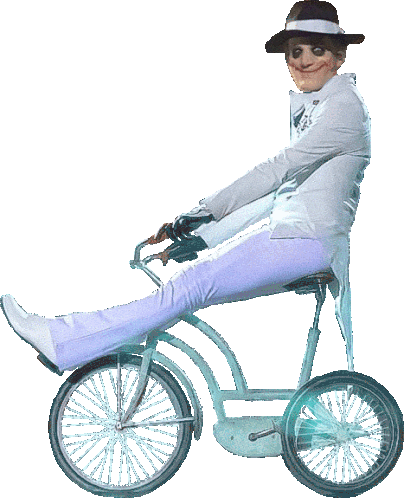 The Band Ghost's Cardial Copia, in a white suit and hat, rides a light blue tricycle with glowing wheels, smiling eerily.