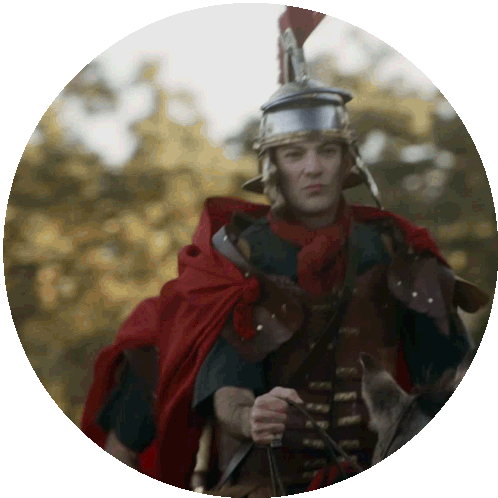 Quintus (Brandon Potter) from The Chosen, wearing a Roman-style helmet and red cape, looking determined.