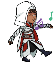 a cartoon drawing of a man in a white hood holding a music note