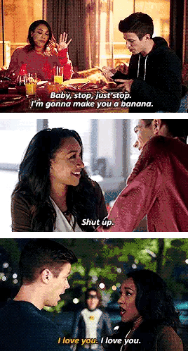 Iris West and Barry Allen share playful banter and a loving kiss, expressing their affection in sweet moments from The Flash.