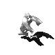 A pixelated, grayscale animated ghoul or ghost creature emerges from shadows, creating a frightening and eerie effect.
