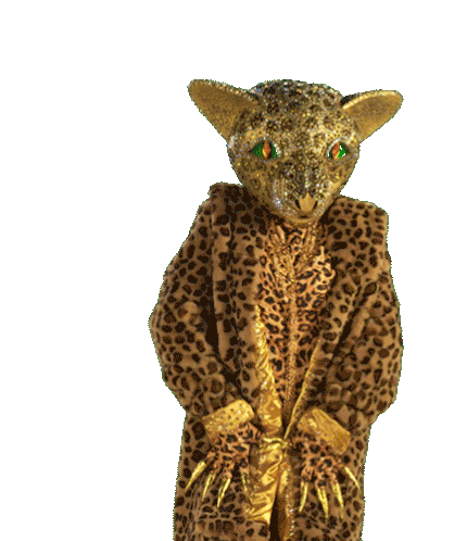 a person in a leopard print coat is pointing up