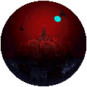 Pixel art red orb sticker featuring a dark cityscape, a bright blue moon, and subtle animation.
