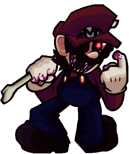 Cartoon drawing of Mario Exe, the plumber, holding a wrench and giving a middle finger in a down pose.