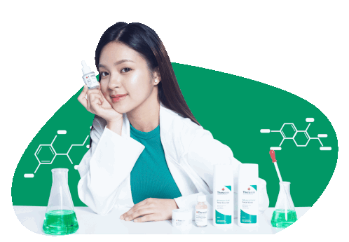 A smiling woman in a lab coat presents Theraskin Ecaaura skincare products with chemical structures in the background.