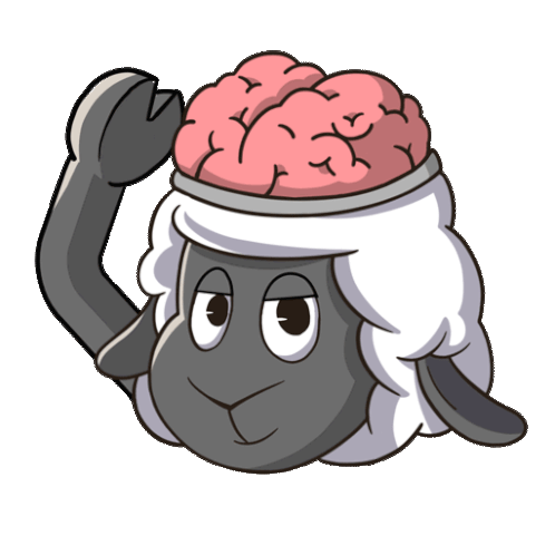 A cartoon sheep with an exposed pink brain, looking sad and thoughtful, scratching its head, representing overthinking.