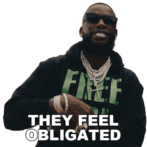 Gucci Mane points directly at the viewer with the text 'They Feel Obligated' appearing, conveying a strong, assertive message.