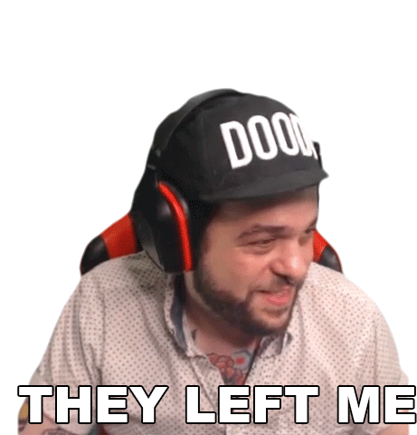 Doodybeard, wearing headphones and a cap, looks sad with the caption 'They Left Me', expressing feelings of being abandoned.