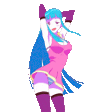A pixel art anime girl with long blue hair and a pink dress dances energetically. Her movements are lively and expressive.