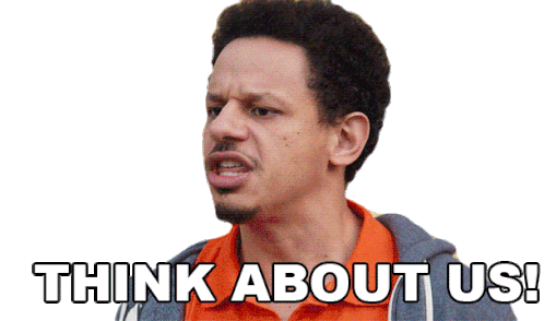 Eric Andre, also known as Chris Carey, says 'Think About Us!' with a concerned expression from the movie Bad Trip.