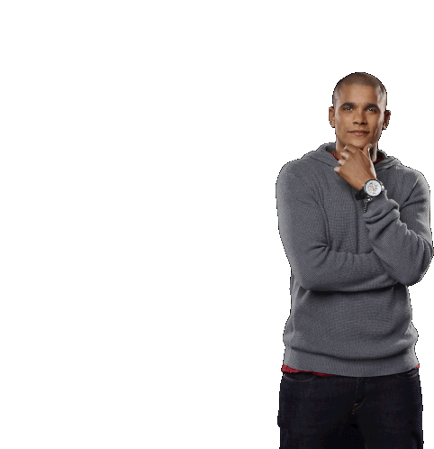 a man wearing a grey hoodie has his hand on his chin and a watch on his wrist