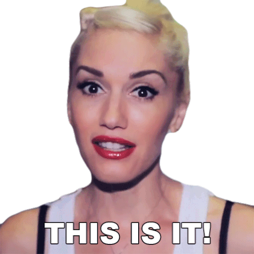 Gwen Stefani, with a surprised and excited expression, declares 'THIS IS IT!' with bright red lipstick.
