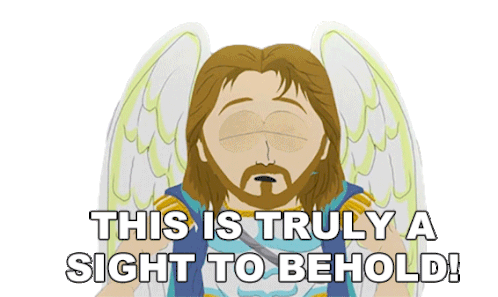Archangel Michael from South Park reacts with wide eyes, exclaiming 'This Is Truly A Sight To Behold!' in awe.