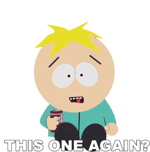 Butters Stotch from South Park reacts with a surprised and then sad expression, holding a soda can, asking 'This One Again?'