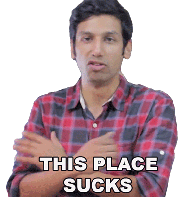 Kanan Gill, with arms crossed, expresses his disapproval by saying 'This Place Sucks', conveying dissatisfaction.