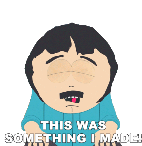 Randy Marsh from South Park looks distressed, then clenches his fists, and finally spreads his arms while declaring, "This was something I made!"