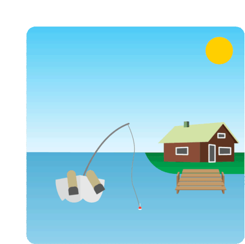Animated sticker depicting a person fishing from a boat near a traditional Finnish summer cottage under a sunny sky.