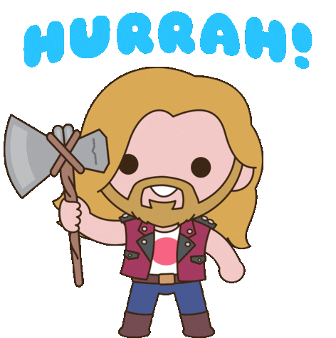 Animated sticker of a cartoon Thor from Marvel Studios' Love And Thunder, wielding an axe with a triumphant 'HURRAH!'.
