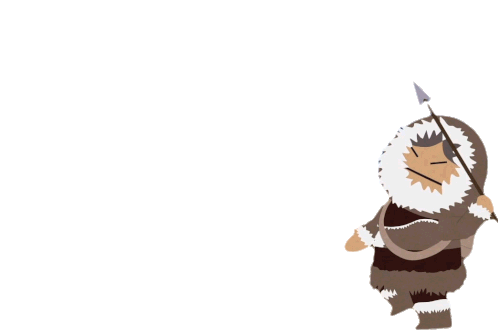 A South Park Inuit character, possibly Super Mom, in a fur coat, holding a throwing spear with a baby on her back.