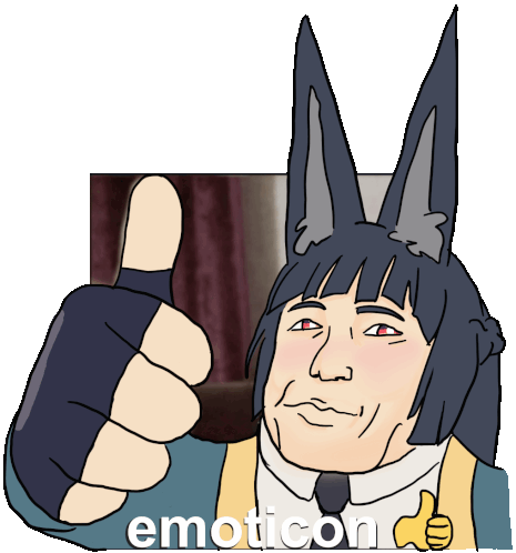 a cartoon drawing of a man with bunny ears giving a thumbs up with the word emoticon below him