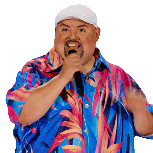 Gabriel Iglesias, the comedian, gives a cheerful thumbs up while holding a microphone, wearing a vibrant shirt.