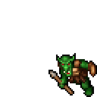A pixel art green goblin from Tibia, with red eyes and horns, walks while holding a club and wearing a backpack.
