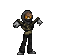 Pixel art animated sticker of Ticci Toby, also known as Toby Rogers, in a hoodie, holding two axes.