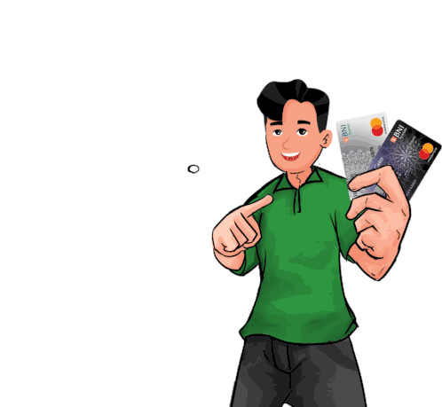 An animated man points to BNI Hasanah Debit and Credit Cards, promoting free entry to ITE 2019.