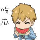 a cartoon boy is eating a slice of watermelon with chinese writing behind him .