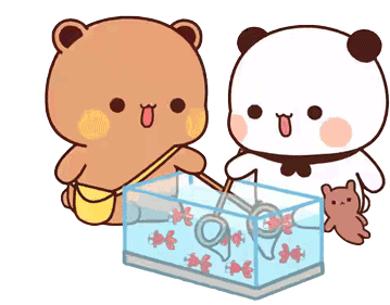 Bubududu and Tkthao219, two adorable cartoon bears, playfully fish for goldfish in a small aquarium.