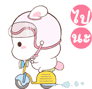 Tkthao219 bunny character in a helmet rides a yellow scooter, with Thai text 'ไปนะ' meaning 'Going now'.