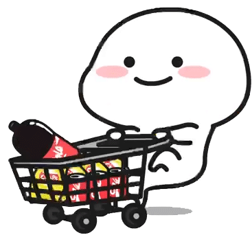 Quby, the cute cartoon character, pushes a shopping cart containing a bottle of Coke, ready for a fun shopping trip.