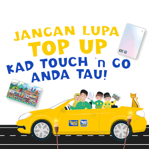 Animated sticker reminding users to top up their Touch 'n Go card, featuring a family in a festive car.