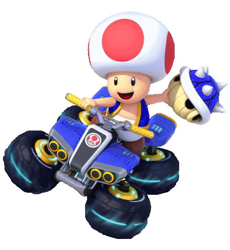 a toad with a red circle on his head is riding a four wheeled vehicle