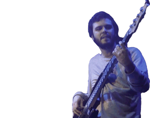 A musician from the band Taburete passionately plays an electric bass guitar on stage, creating a vibrant musical performance.