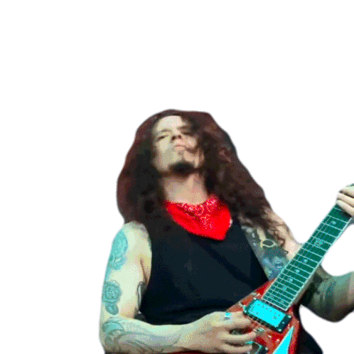 Charlie Parra Del Riego passionately plays his red electric guitar, headbanging to the rhythm, showcasing his rock energy.