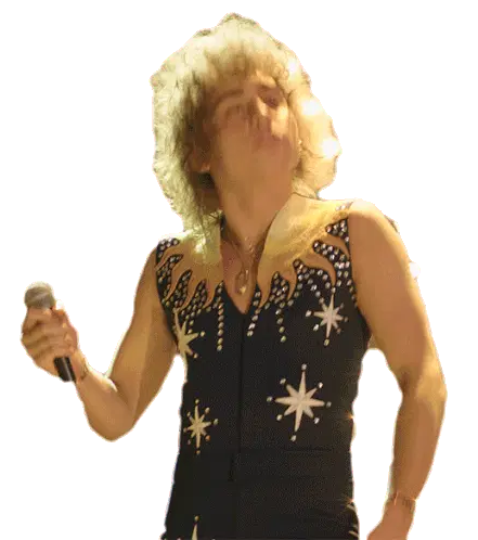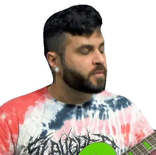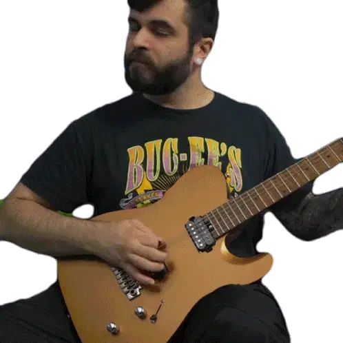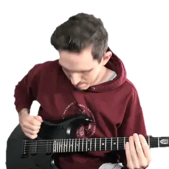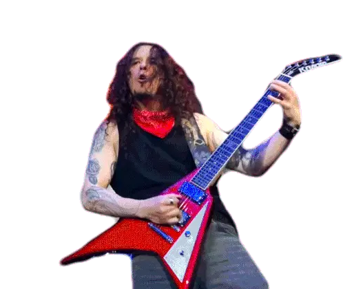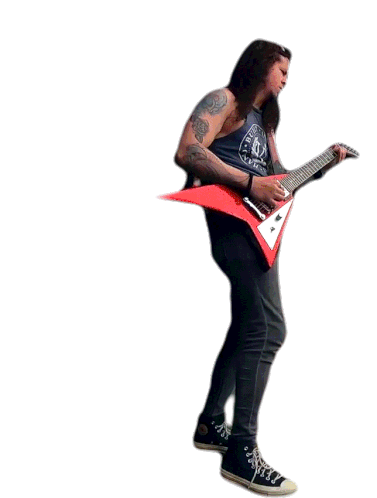 Charlie Parra Del Riego, the renowned guitarist, passionately plays a red electric guitar, rocking out with long hair.