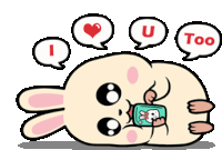 A cute Todo Yo rabbit lies down, engrossed in its phone, surrounded by floating hearts and expressing 'I love'.