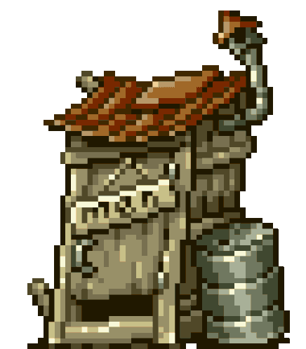 A pixel art animation of a rustic outhouse, initially intact, then revealing a surprised soldier sitting on the toilet before it collapses.
