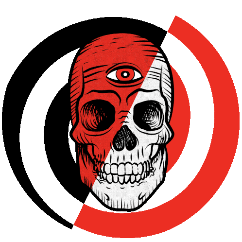 A striking Tokebi Iamtokebi skull, split red and white with a third eye, against rotating black and red circles.