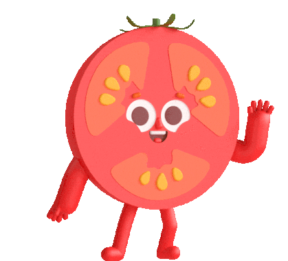 A cheerful, cartoon-style tomato character with a happy face, arms, and legs, waving hello with one hand.